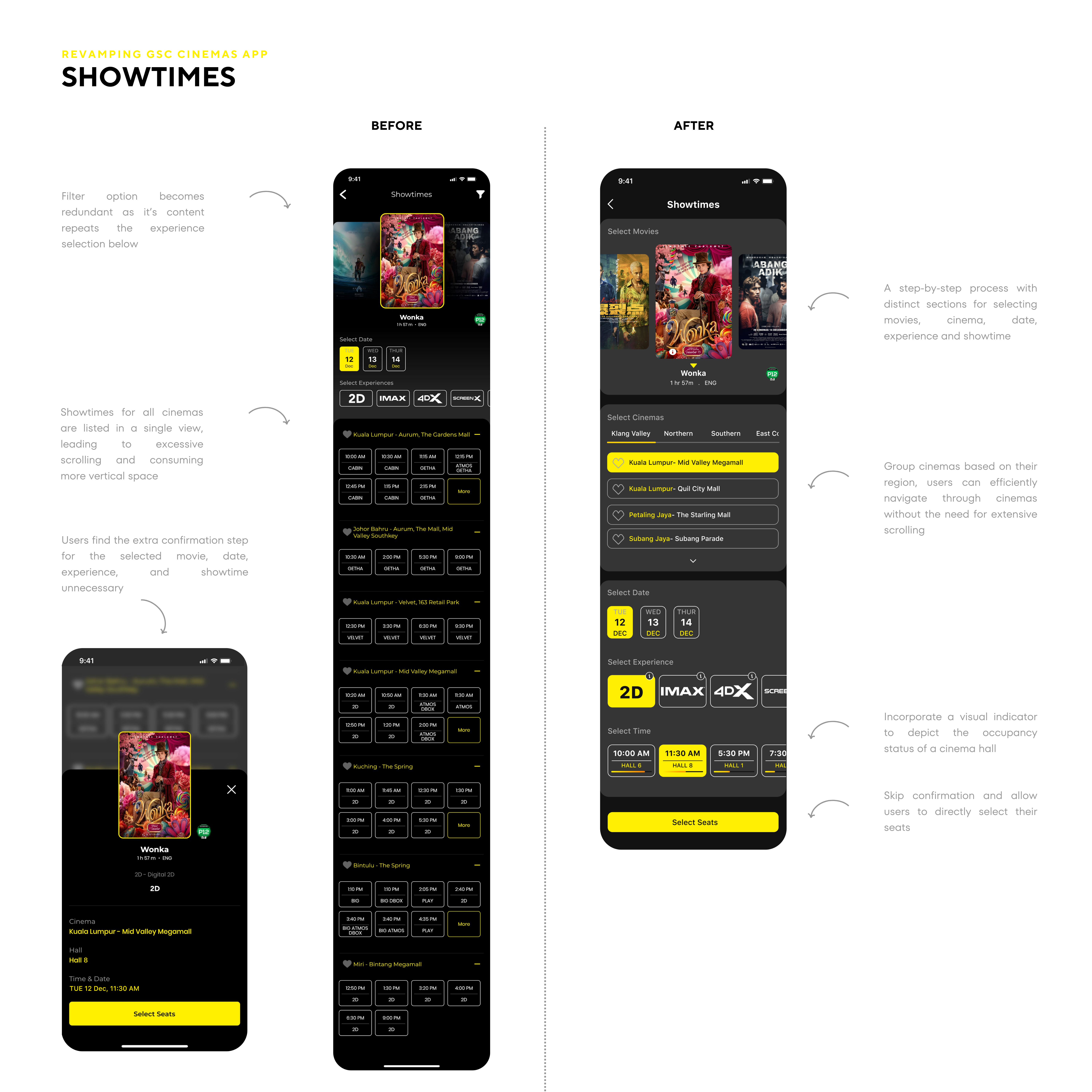 Users, when selecting seats, face challenges as they cannot easily explore and switch between available show times.